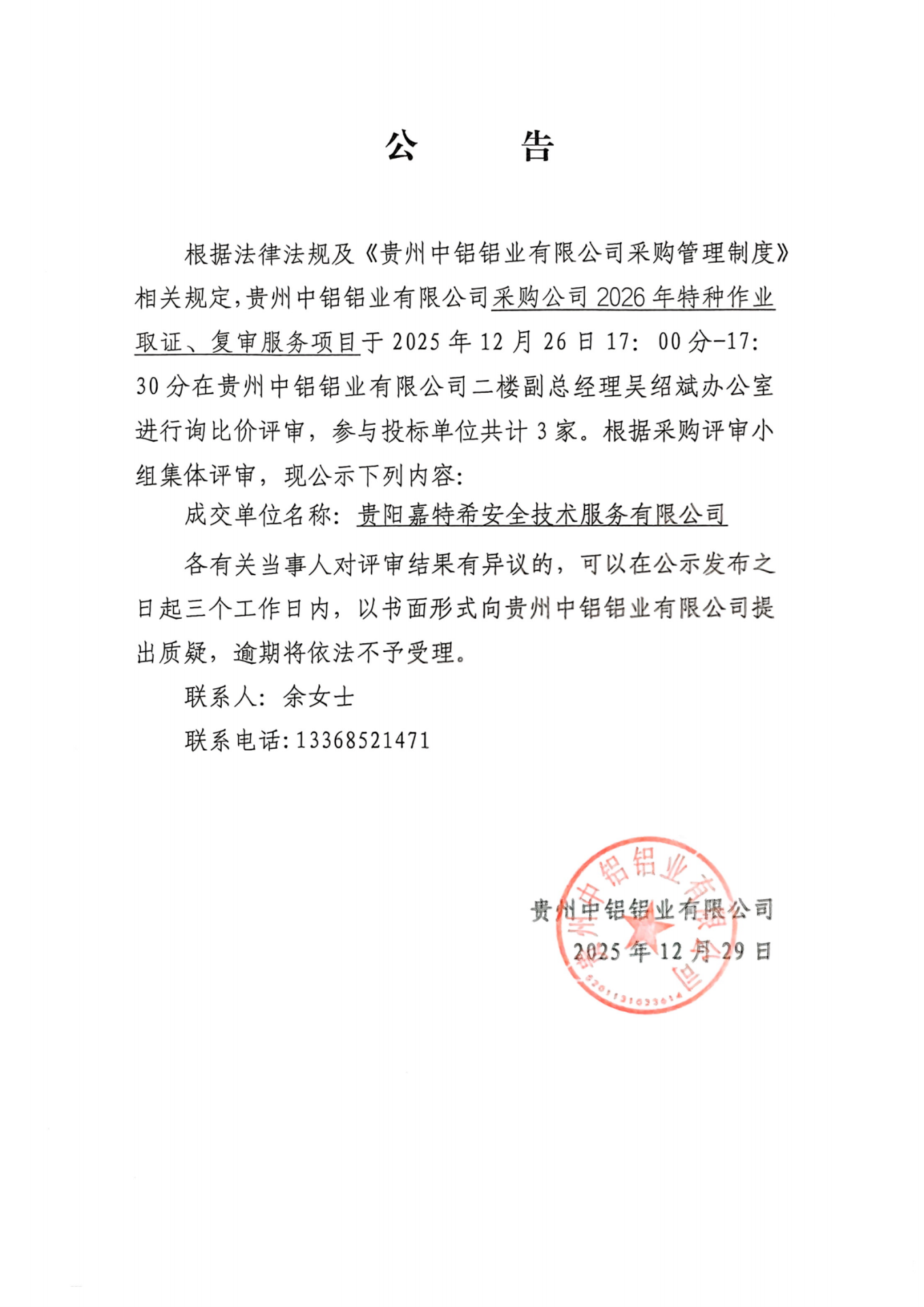 貴州中鋁鋁業(yè)有限公司關(guān)于采購2026年特種作業(yè)取證、復(fù)審服務(wù)項目中標(biāo)結(jié)果的公告
